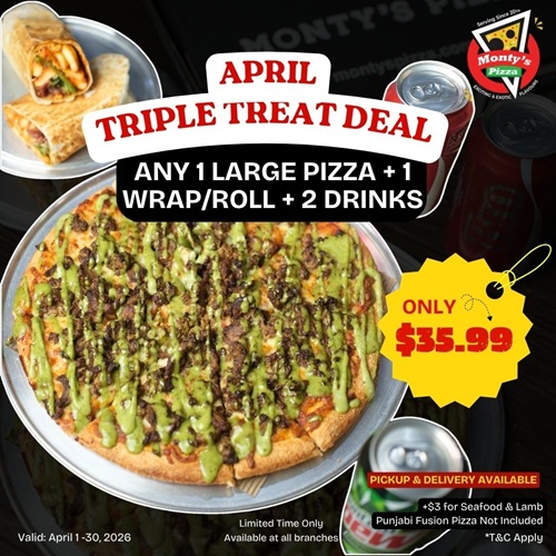 April Triple Treat Deal$35.99Any 1 large pizza , 1 wrap and and 2 can of drinks.